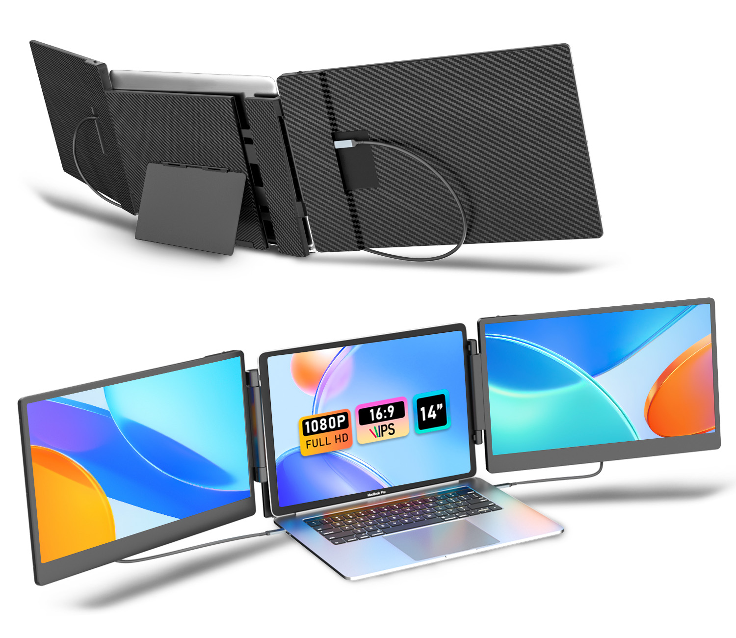 14-inch 1080P FHD IPS Panel Ultra-thin host design Lightweight for Travel Plug and play, no driver installation required Built-in two loud speakers